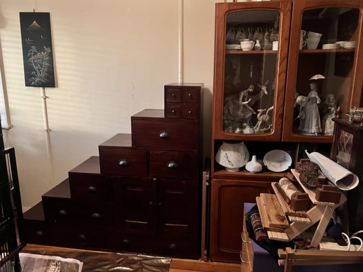 By the grace of all the gods but especially by the beautiful gracious assistance of Lyn, Peter, Bailey and Rodney and Mirelle, I now have this new (secondhand) step cabinet. I bought it for $50 which is a bargain.