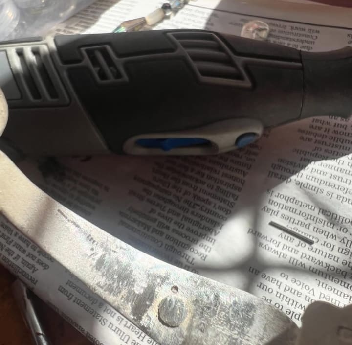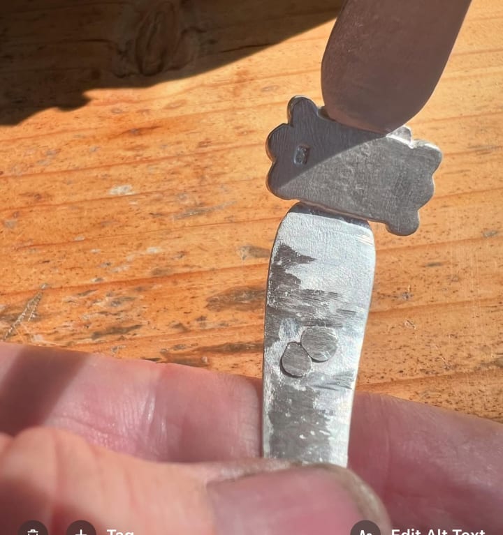 10:54 am I am still working on my cuff. I smashed the shit out of it with the glorious back end of my chasing hammer which worked to great effect. I also drilled a hole for a second rivet cos this little bitch is gonna succeed if it kills me (it almost has…can you tell?)