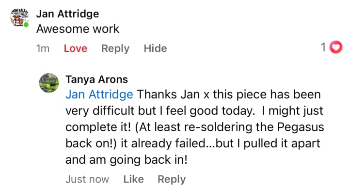 I also filed and sanded back the end in preparation for soldering Pegasus back on arggghhh!) but I know one thing about myself now…I am singleminded, hyperfocused and intrepid with a mind like a steel trap… if called upon. No more playing small in my life. It’s just a bracelet but it’s become a symbol of my resilience and guts! Yeahhh…Babies!