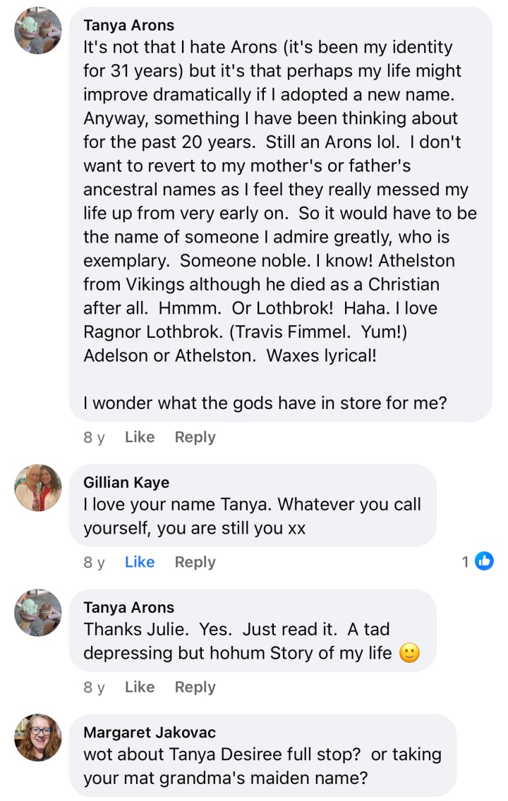 Jarrod says it is outrageous and I should stick with Arons after 30 years. I guess so! It has been my name for so long it's hard to imagine being any other name. My long ago deceased parents in law were very good to me. Unlike the rest of that horrible abusive toxic family. Ughhh.