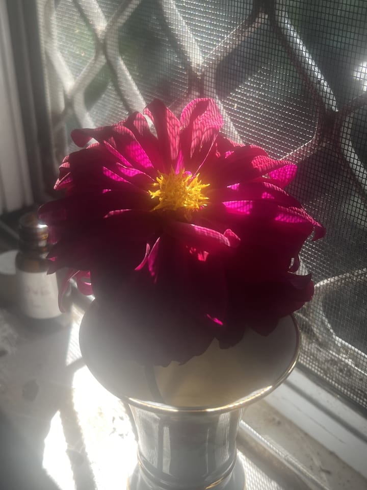 My dahlia bloom is dying yet she is still exquisite, suffused in light and shadow, drifting in an ocean of sun refractions, and dark matter. Voyaging to the Return…