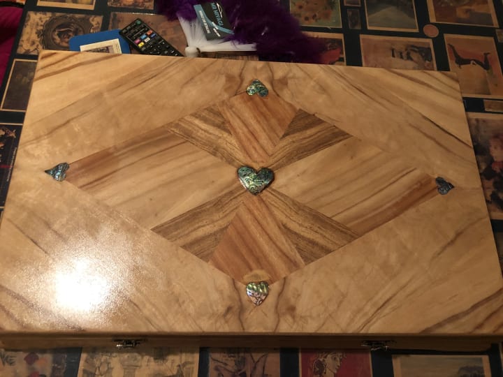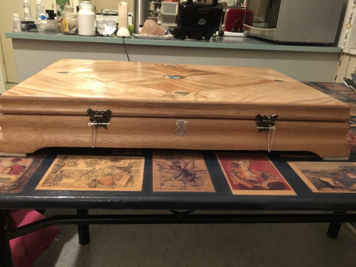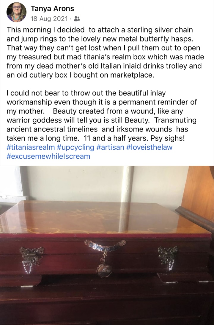 Then I sanded back my cutlery canteen, varnished it and installed the hasps and the sterling silver “T” for Titania’s Realm.