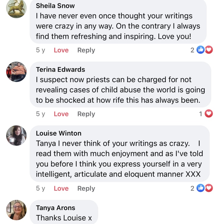 I told him how people think my writings on the internet are crazy. He said that is typical of Abusers. Easy to delegitimise victims as crazy and invalidate them so they can't stand up for themselves or fight back.