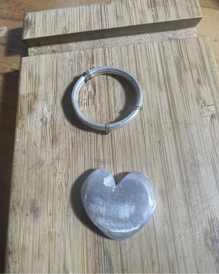 I sawed my rough circular ingot into a love heart. I just need to buy some yellow ochre powder or some “Whiteout” so I can solder the two sterling silver rings together at the base for a split ring.