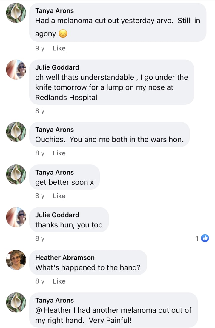 Well that was painful. He froze off the thingy on my forehead that had actually grown back. One on my thigh, several on my back and shoulders and two on my tattoo (sitting close together!) It is hurting like Hades.