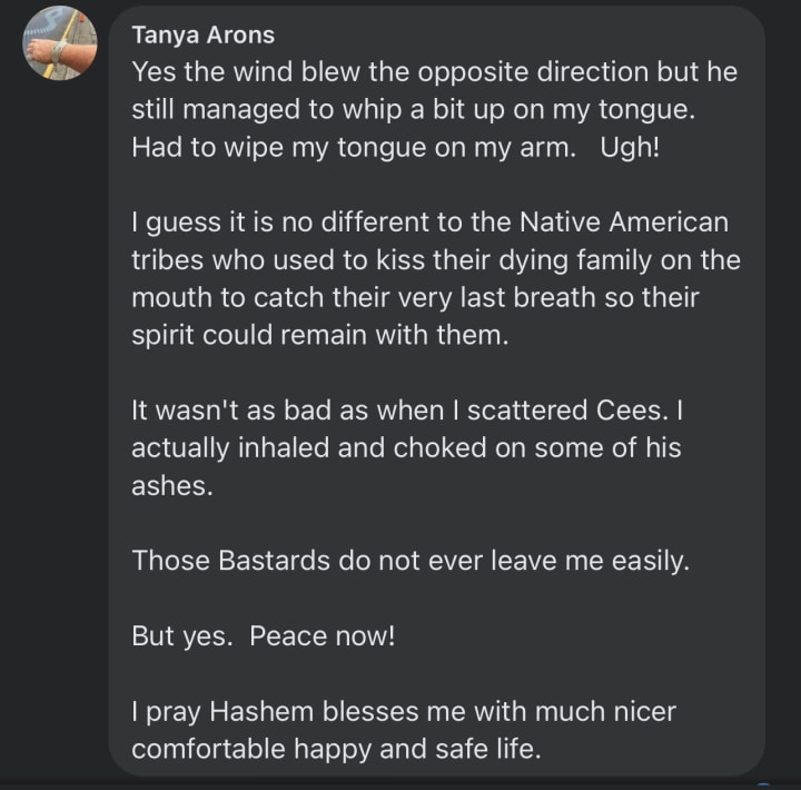 I am free. I am happy. I am blessed. I am loved and the past is just a dead albatross that with Dad's final scattering can leave all my former vicious enemies far behind me. I have closure. I have peace and I now know where all my kin are. Ahem! Lmao!