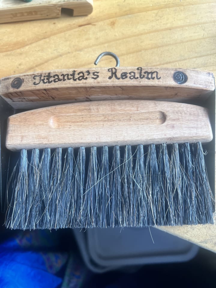 Yesterday I also bought this nifty little dustpan and brush. I decided to wood burn “Titania’s Realm” into it. Then I melted beeswax into the timber to preserve it better.