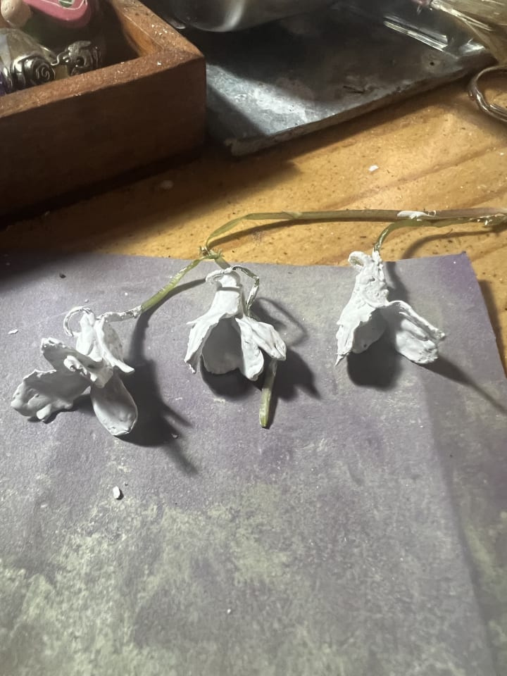 Still drying…I ran out of paste so only gave them two coats. I hope it’s enough… I can’t fire them until tomorrow arvo as you have to dry them for 24 hours…ooohhh the frisson of excitement and the temptation is real…lol. I hope I get at least one to work out. I made three (two for earrings and one for a matching pendant) but one petal already fell off so that one is already scrap I guess. #homegrownvioletsfromMySacredSpacegarden #silverclayjewelry