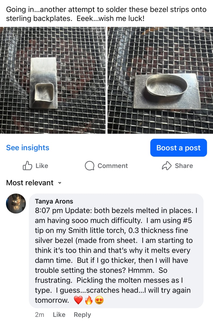So today I will attempt that bezel again. I would like that cuff finished in time for my birthday. Setting myself a reasonable goal here. I hope I don’t melt the bezel wire again as the fine silver sheet I bought to make it with, is kinda expensive and I already wasted one.