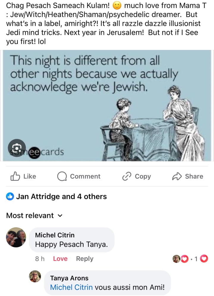 Chag Pesach Sameach! Happy Passover! May the Holy Light from Above envelope you in freedom from Oppression, Peace and Eternal Love. May all who are suffering find redemption, abundance, prosperity, wisdom, kindness, good health and a full and happy life.