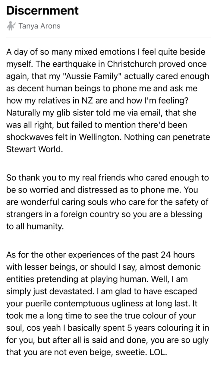 Now she moonlights on a page in support of a fellow Manchester woman who had unfairly had her children torn from her. Every time I see her active on there: I feel sick. Her vicious slander led to my marriage breakdown (my marriage was already Toxic beyond belief) but that cascade of cumulative trauma put the final death knell on it.