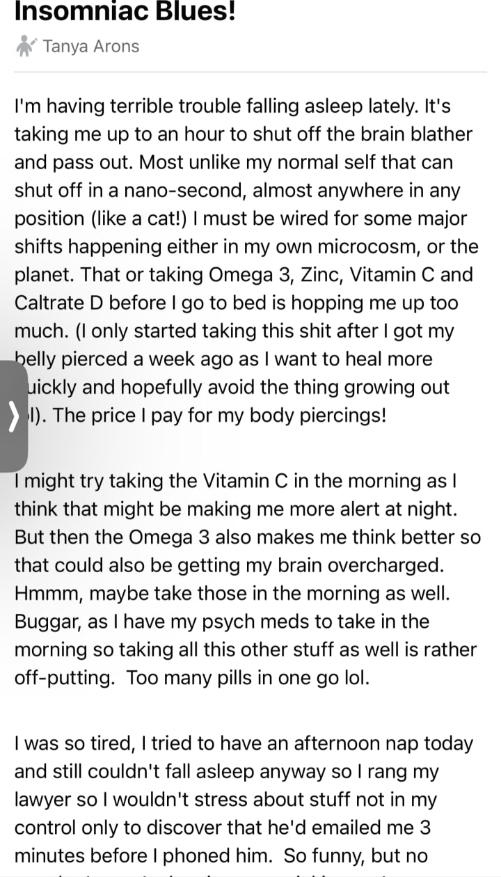 Possibly years of insomnia to look forward to if I keep living that long. All very inconvenient. I need quality of life not dragging my carcass through in quiet (or ostentatious! Depending on my mood) desperation for the remains of my days (and nights!)