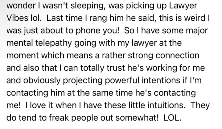 Then I came home and was going to have a nap cos I am so tired, (I went out last night after gardening all afternoon, and had blueberry pancakes with chocolate sauce and Ice cream at the Pancake Parlour with Crystal and Jarrod) but I must have overdone it cos I feel exhausted but I rang my lawyer to check on progress, and had a laugh cos only 3 minutes earlier, he'd emailed me. Talk about ESP lol.