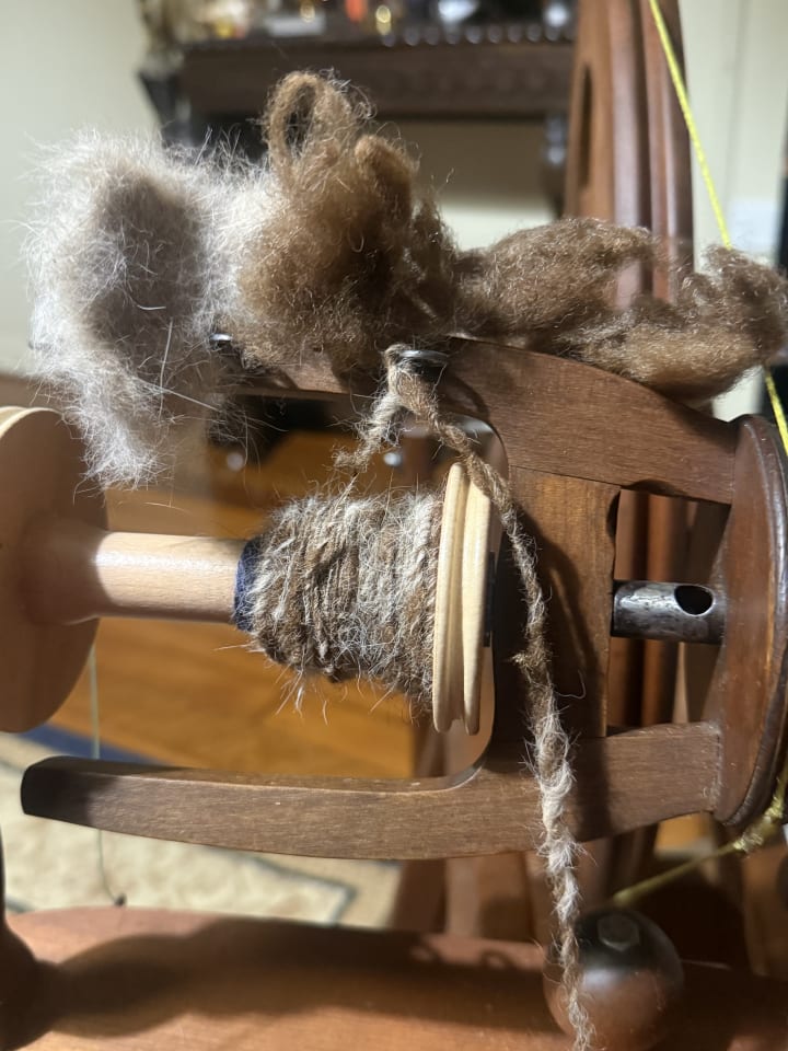 Spinning a very coarse almost “sticky” sheep fleece with Sophie’s fur. Yup…another memorial wool being created. After this I have a few bits of Beauregard’s fur to be spun too. #titaniasrealm #ashfordspinningwheel #spinsterdivorceesgonerogue #sophiecatawesomeandsweet