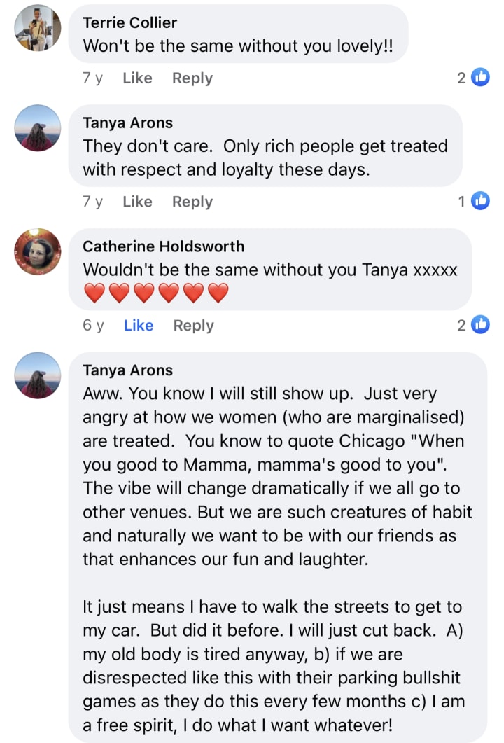 Without the sexy audacious delicious women dancing wildly every.single.weekend, who is going to come and leer and buy drinks all night? I think the Treasury could afford to let a small group (about 8 of us) have the respect and courtesy of free parking. We don't abuse the privilege. We leave at 4 am. Usually.