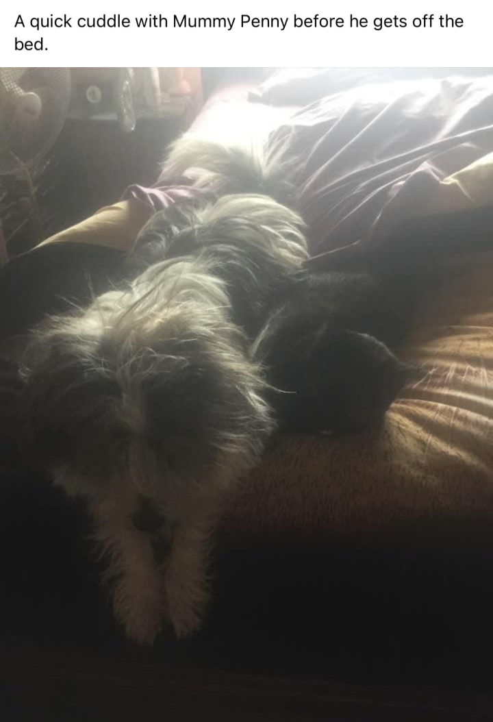 He went up to the pet fence and Ramon moved over to him and through the fencing, they touched noses. A bunny/kitten kiss!