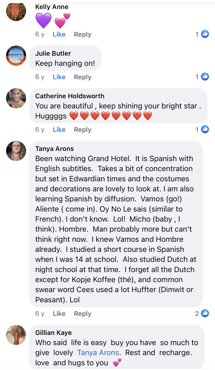 I said “I know. I nearly died in that last surgery, you pointed the bone at me with. I know I could go at any time so yeah... I just keep dancing and loving and living no matter what. Even if it hurts”.