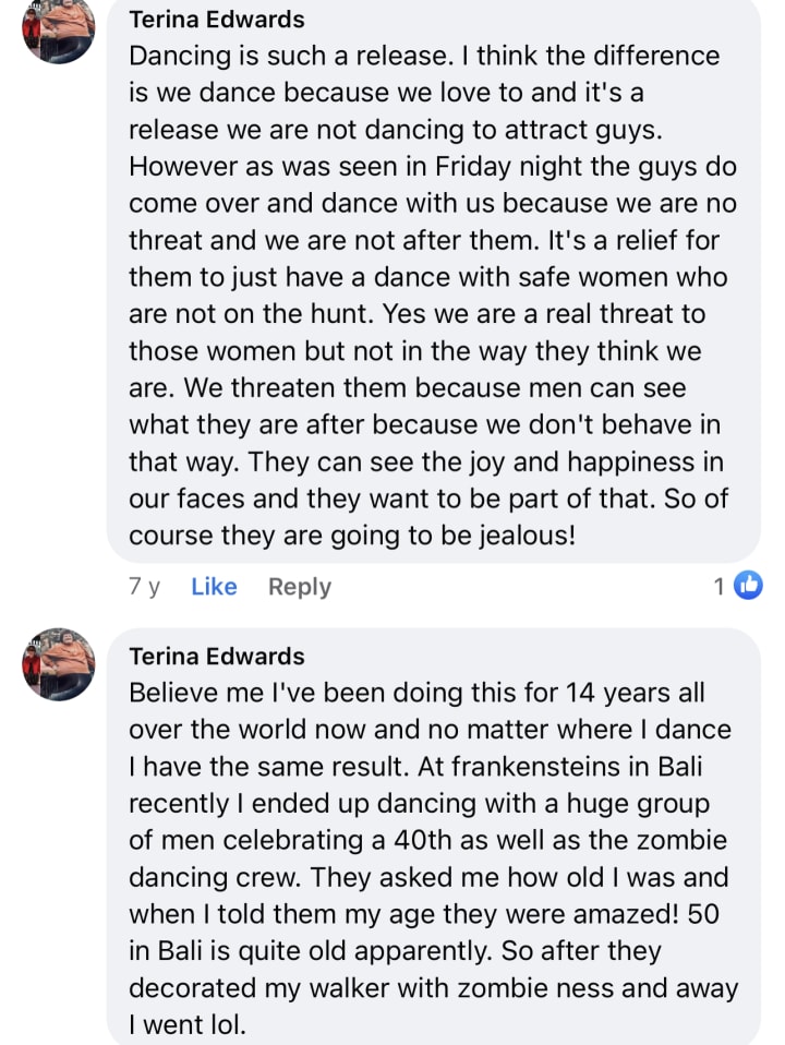 Anyway, I am over it now. Women are hated and detested in the city and country. Domestic Violence is out of control. Violence in public venues is out of control and I am well aware that even though I dance in a primal manic kind of way which men find either tantalising or threatening, that I have been a source for good most of my time on my nights out, making sure the women around me are safe.