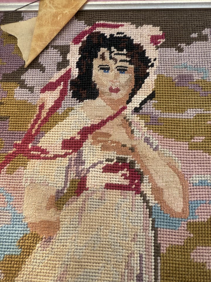 Pulling apart “Pinkie”. I made this tapestry when I was 10 years old. The frame is missing a huge chunk and the pink velvet has faded. I will wash “Pinkie” and If she holds together all right, I will turn her into a bag. Give her a second life. Fifty years old. Transmute the old into something new. Or let it go when it’s no longer feasible. #titaniasrealm #tapestry #pinkie #outwiththeoldinwiththenew #upcycling