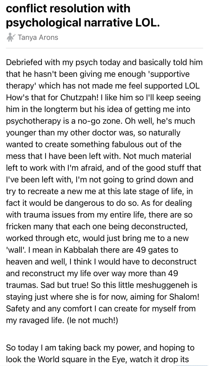 I just made an appointment with a new optometrist too, as my former Jewish one (a friend of Heather’s) had the arrant vicious chutzpah of regularly calling me “crazy”. The bitch gets paid to test my eyesight and is not my mental health professional ! So another one I had to distance from!