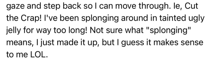 ….Oh ok thanks Jarrod, I thought I made up a new word for dancing and trudging through the gelatinous substance, the mush and muck, the flotsam jetsam, the incredible sludge that is my life. I guess, I read the word splonge somewhere. Glad to see it sorta fits. LOL. Now I'm not a lexoquacious genius, I will endeavour to not come up with new, non-words LOL