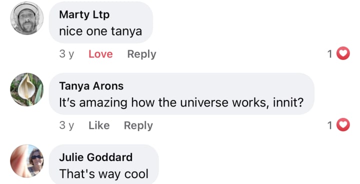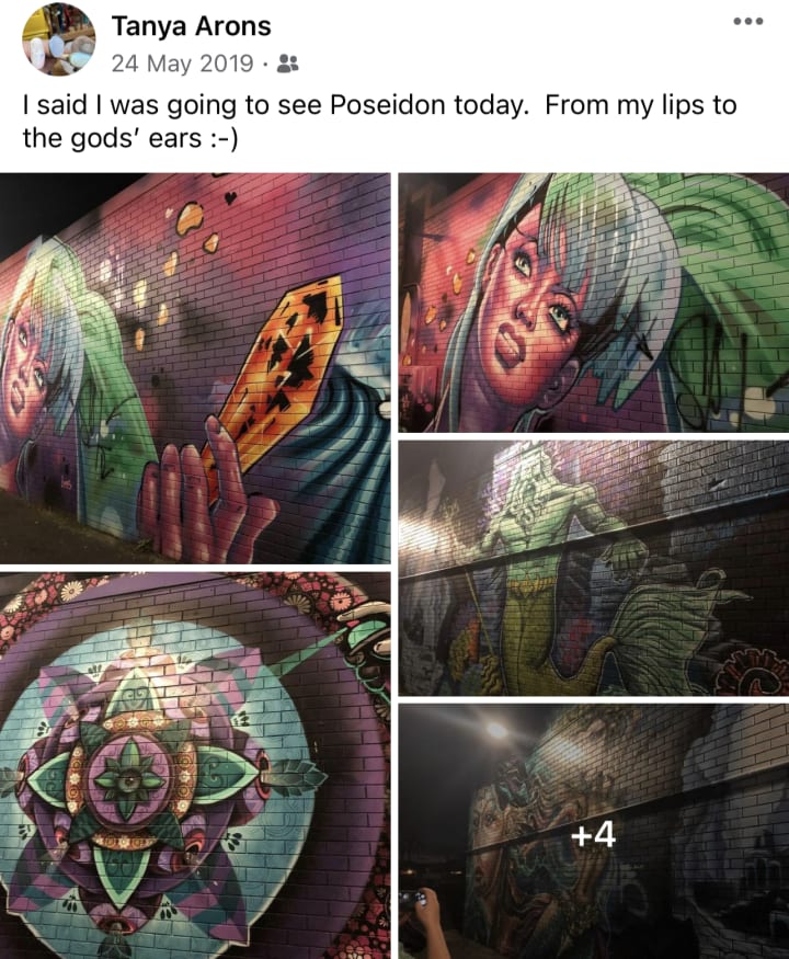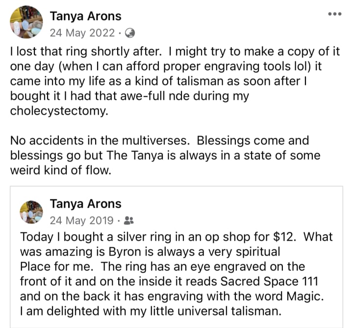 Today I bought a silver ring in an op shop for $12. What was amazing is Byron is always a very spiritual place for me. The ring has an eye engraved on the front of it and on the inside it reads Sacred Space 111 and on the back it has engraving with the word Magic. I am delighted with my little universal talisman.