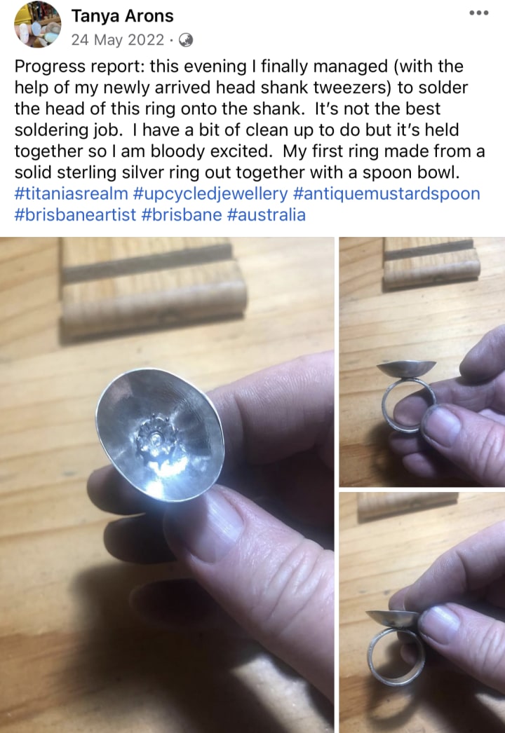 The fourth prong fell off when I set the stone. I wore it anyway as I was so happy to have (almost!) completed it. But when I came back from our walk I spent a few hours trying to solder the fourth prong back on. To no avail.