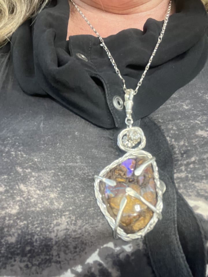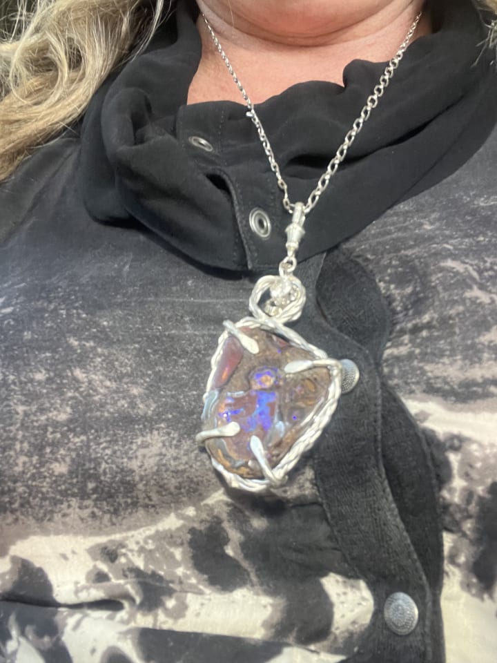 Here she is…little Aussie (Queensland) Boulder Opal and me. Together as wearable art after 30 years lying around in my crystal collection.