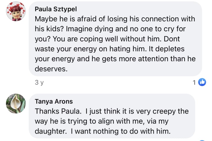 I reminded her that although he will forever remain Her father that he is my ex husband. That he paid two people to attack and strangle me when our marriage ended and that although I never reported him to the police (a deep regret of mine) as I feared for my life and my children’s, that he remains the most vile disgusting pig in my eyes.