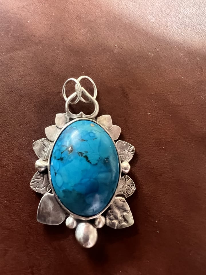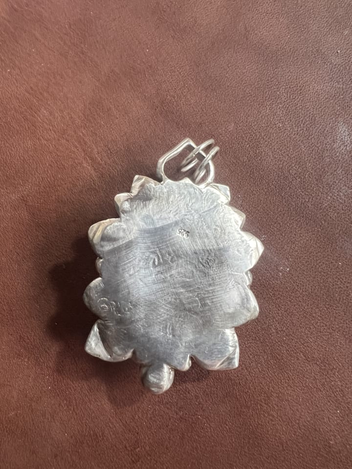 The finished piece. LOS the engraved hearts and the back polished with Renaissance wax . I lost the sheen by sanding off the mars on the stone. But I am still happy with it.
