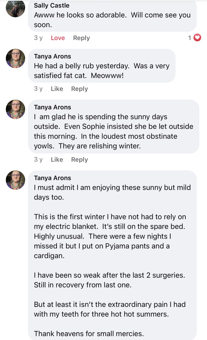 Crystal has Covid and is too sick to talk but she tells me she is alive. I am sending her my preternatural extra strength that runs in our bloodlines. The Arons Women are powerful in our cores. But rest she must.