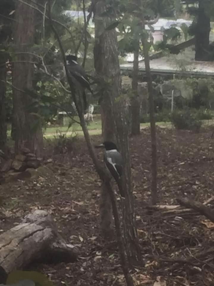 So anyway I lay here, dozing then heard Charlie shrieking in a strange distressed voice. (I had left him outside on his cage). So I leapt out of bed and ran outside to discover him sitting on top of his cage with a crow sitting on top also, facing him off.