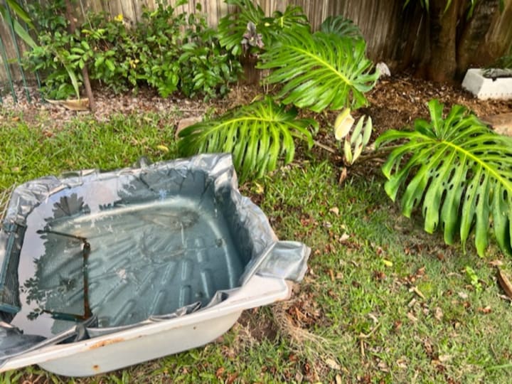 I’ve been upsetting myself for about a week over my leaking rusted out shower stall I use for a birdbath. This afternoon I had a eureka moment. Proper pond liner costs $75 but I had this left over plastic I used for floor covering when I was pouring resin on my decoupage projects.