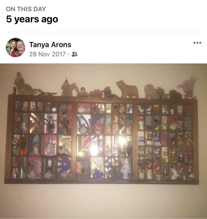 My collection of Knick knacks: perfume bottles, German Harz mountain figurines. Old brooches etc.