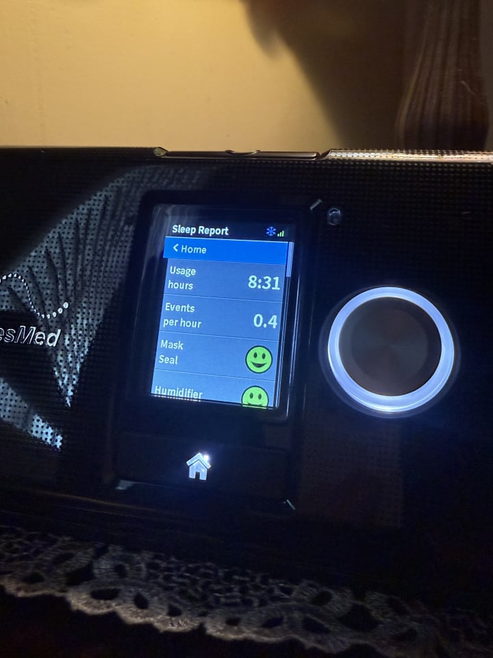 7:47 am better breathing results. Still can’t knock it down to 0. Cpap is improving my clarity of thought. But I still stop breathing in my sleep. Zombie! Shuffle…shuffle. Reclaim my life. Hold my own …alone…alone…but ever intrepidly courageous. Psy sighs.