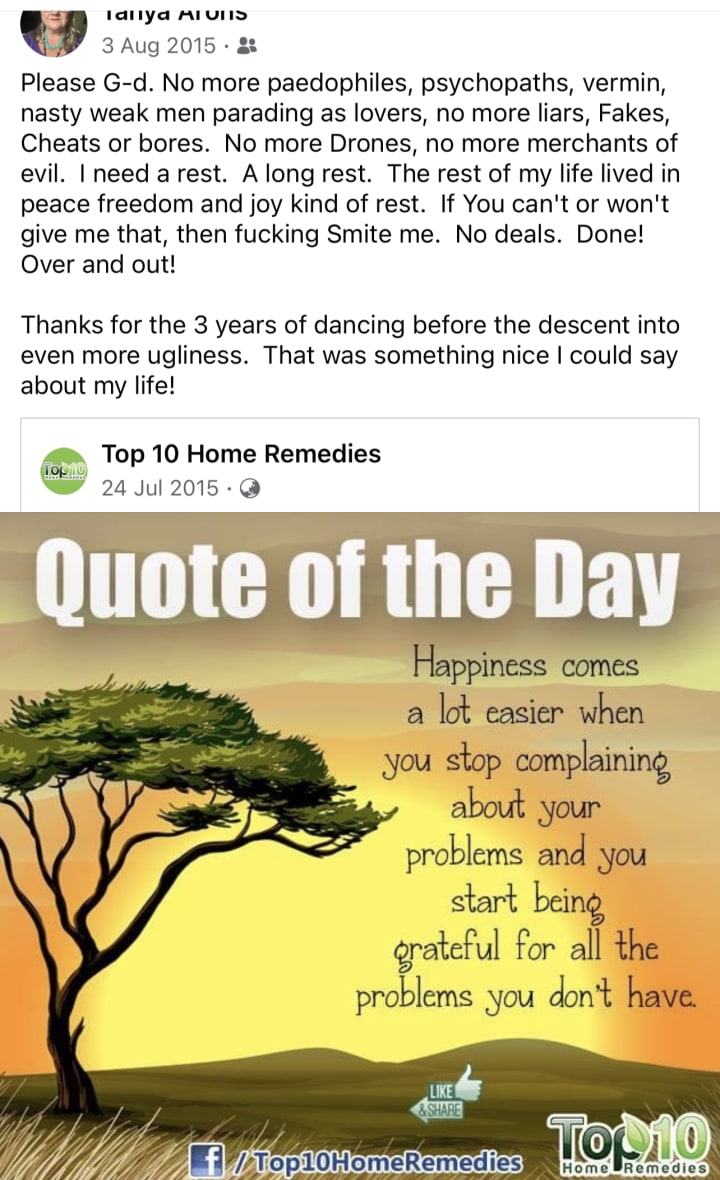 I am rebirthing a new Tanya. If I had enough money I would have gone travelling around the world to commune in every sacred site. As my remnant blood family had dissolved in their own narcissism I have none left to keep me here. (Except for Jarrod and Lyn and other dear friends). Brisssss Bane. Gevalt.