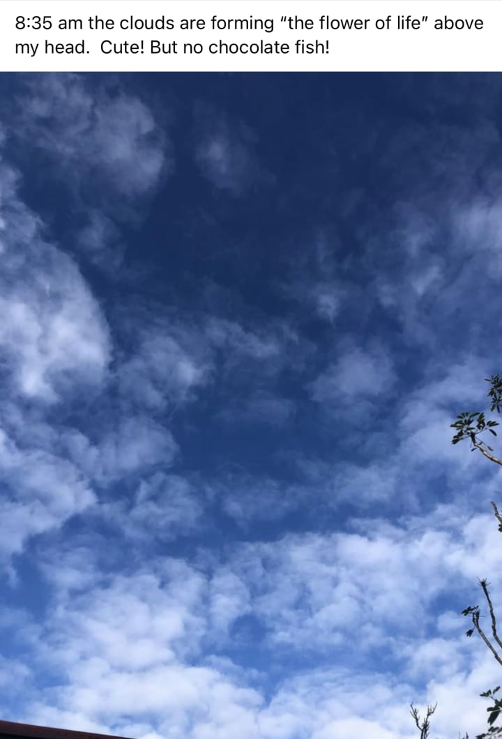 Whimsical creations, spirit communications, even the flower of life in the clouds. Cosmic affirmations. Joy to the world.