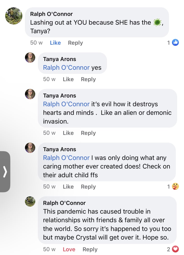 I just had to block Crystal. The viciousness and lashing out at me because she has covid tells me she is so fucking indoctrinated by this disease du jour that she is now dangerous to maintain in my life.
