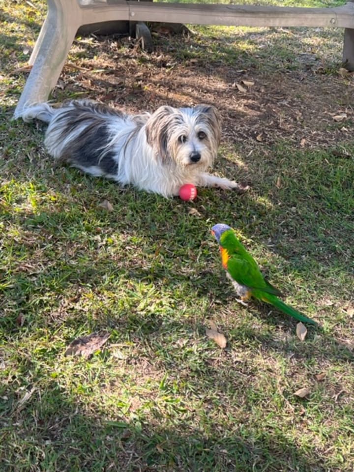 I just had a lovely walk in the forest with Charlie (kiss and shit/shit and kiss all day long). We stopped at the small dog park so I could give Charlie a drink and wash his yellow streaking bird shit off my arms and shoulders. Oh the joys of Rainbow Lorikeet Motherhood!