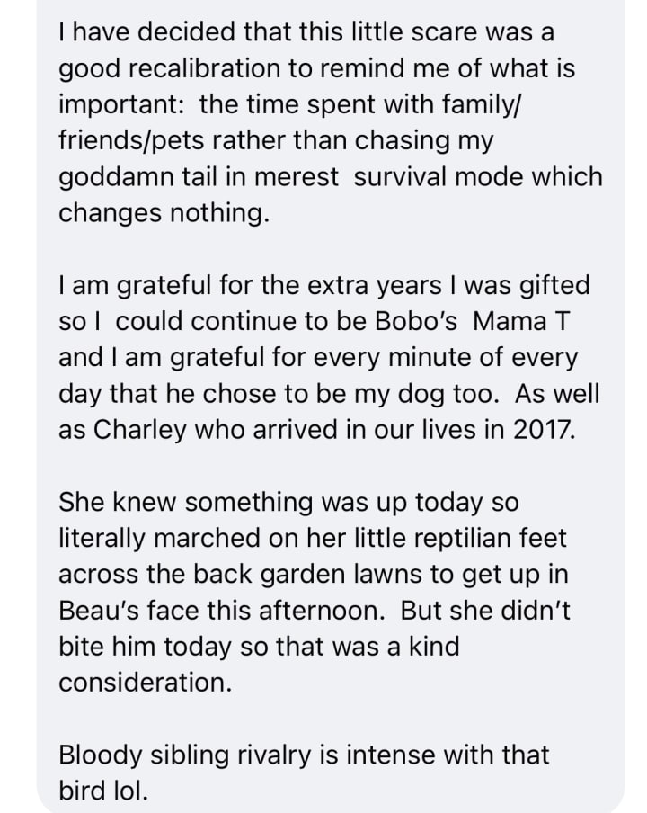 Beauregard is still very weak. We snuggled in bed until after midday. He did another hard little poo this morning. He’s not drinking today, which is a worry.