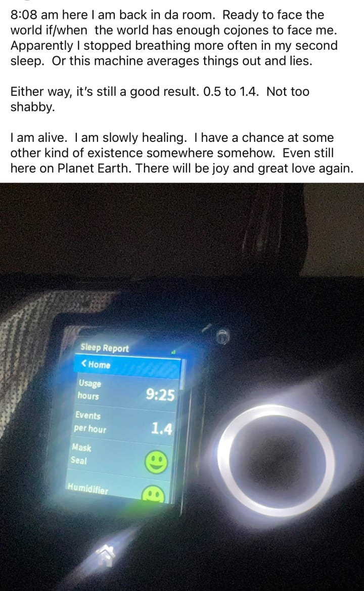 9:47 am awake. Not much sleep. About 3 hours. Maybe not even quite that much. Shoulder is painful. But up and at ‘em. Have a good day, People!