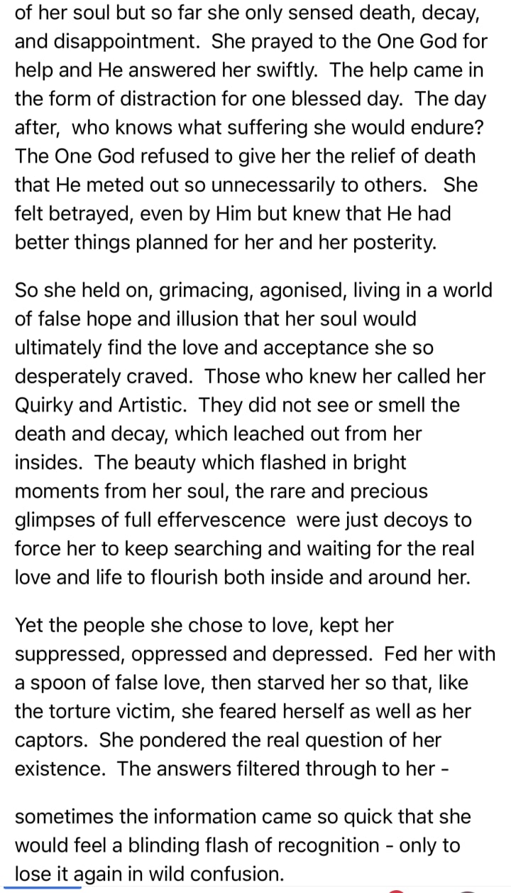 Anyway now you can all sit back and yell “Fuck Facebook” as my muse was an 85 year old woman who like me, was extremely fond of the truth and being heard!