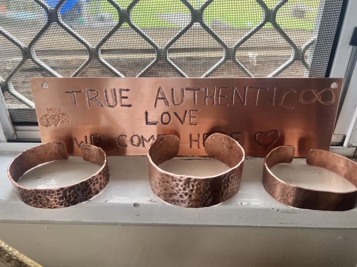 I worked hard today. Coating the sign and cuffs with Protectaclear. Then taking photos and sending them to Jarrod to upload on my Titania’s Realm website.