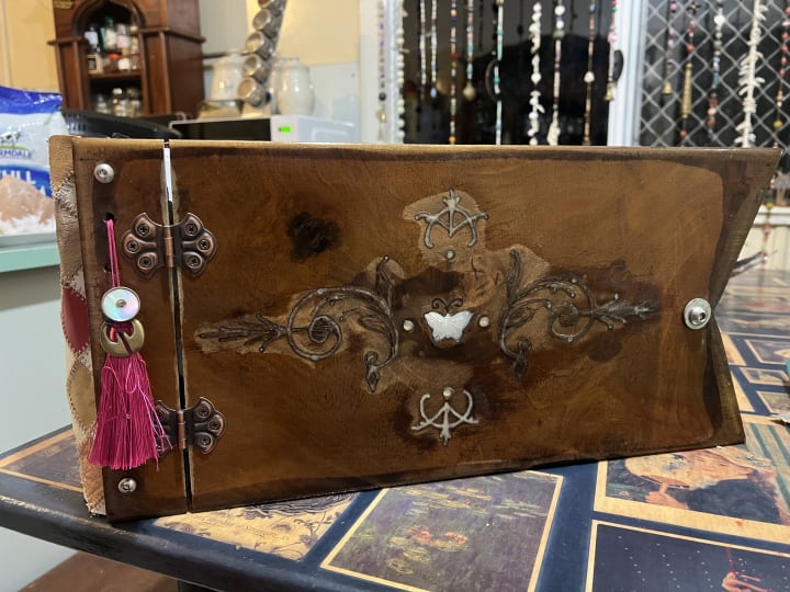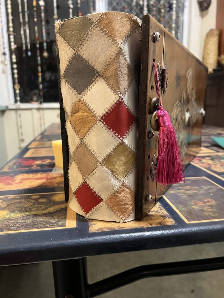 I just finished working on my “Grimoire”. I decided to put a leather “binding” on the “spine” of the book. I used an old scrap of leather that originally had belonged to one of my mother’s handbags. (She had two the same so I gave one to charity and one I cut up).