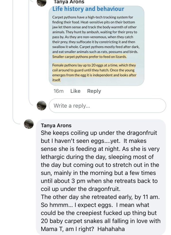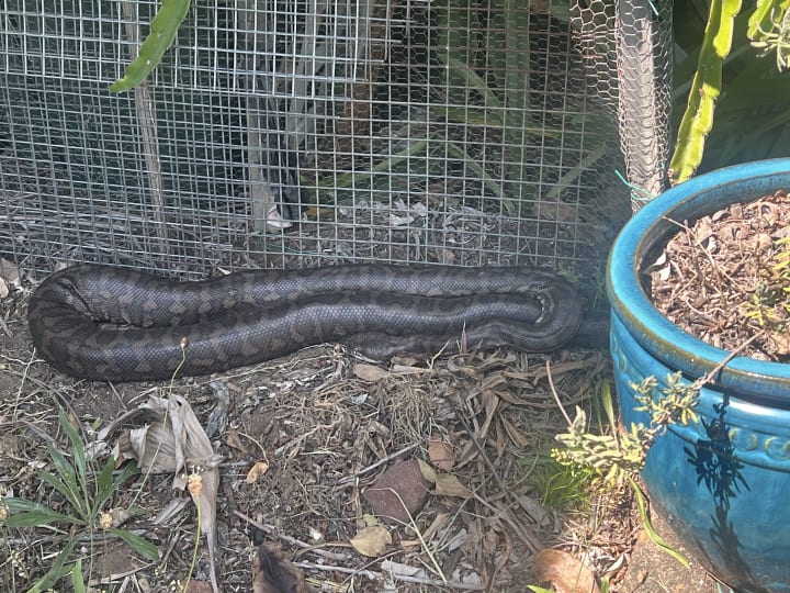 6:15 pm The storm is here. Delicious cooling rain after a hot day. Snakey is safely coiled up in her spot under the dragonfruit. I just went to check on her only seconds before the rain began pelting down.