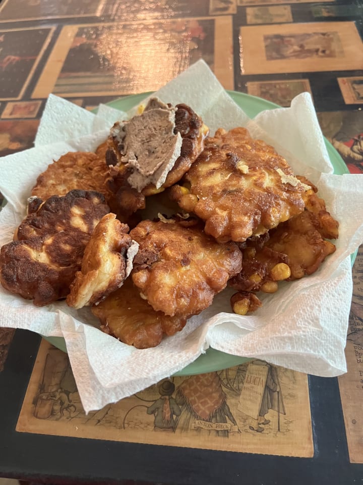 Hungry Mama T craved chips and all sorts of dangerous foods. But I am broke. So I raided my pantry and found two tins of corn so I made corn fitters, topped with the hummus I made the other day 🙂