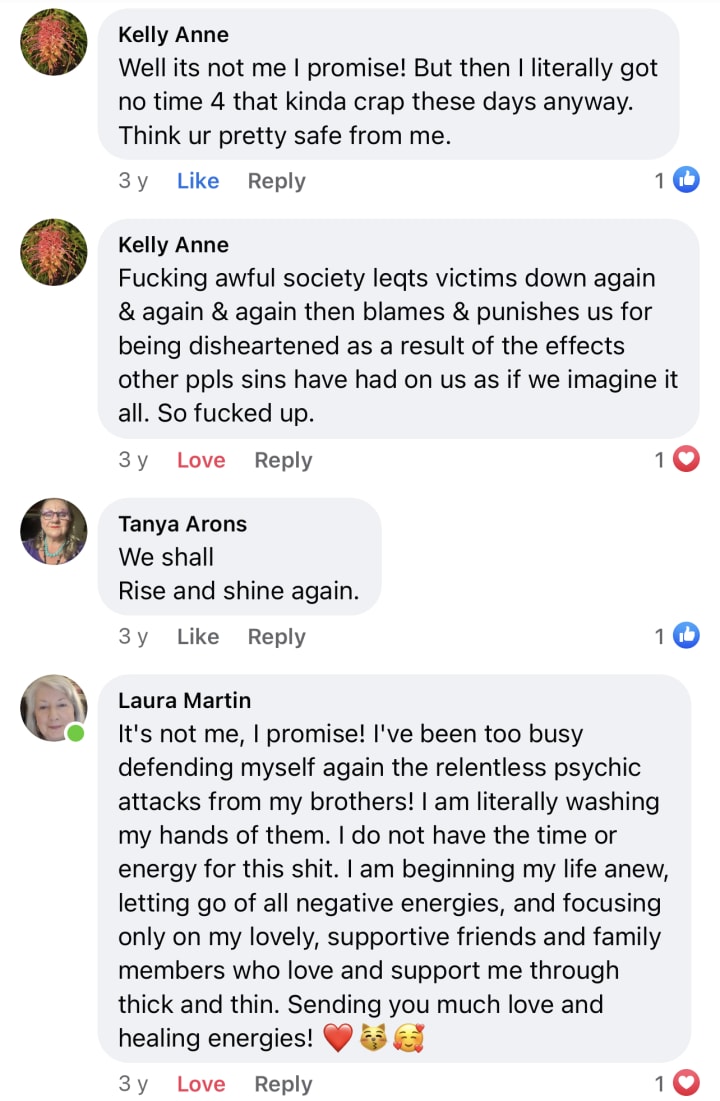 Still they played their role so magnificently out of envy and spite, squabbling over that psychopathic cock supreme like he was some prize. I was the only one who had the guts to stand up to him (which like all Abusers he seemed to greatly admire!). But he is dead and I am free of him at least. His squalling corpse brides can rot in hell with him. I’ll wait....!