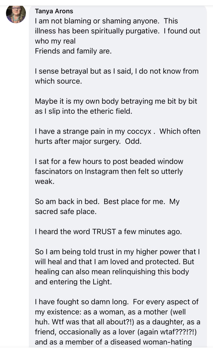 My angels showed me I was loved and protected. But who are they? These angels that send me into mortal danger and gift me men with golden auras who can only fake love to slake their lust (Dave!!!) Yet still they peek and cast aspersions from behind other men’s shoulders as deep down...way deep down inside, that quivering in their glans, and wrinkled twisted hearts they knowwww... my love was true and strong and enduring while they played me for a fool and even my capricious trickster gods had to shield their eyes and shake their heads because The Tanya never ever fucking quit.