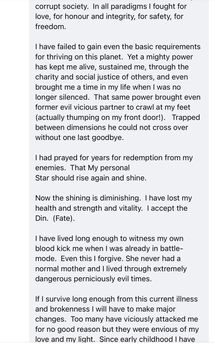 In the face of all deception/betrayal/slander and my own perpispacity. In the face of my own poverty and doubts and fears and rivers of tears and agonies imposed by an unworthy society and a body reaching its final declension but yet still healing itself and raising its standard on the fields of carnage that steal our honour and our womanly pride. I yielded to no abuser nor their handmaiden.