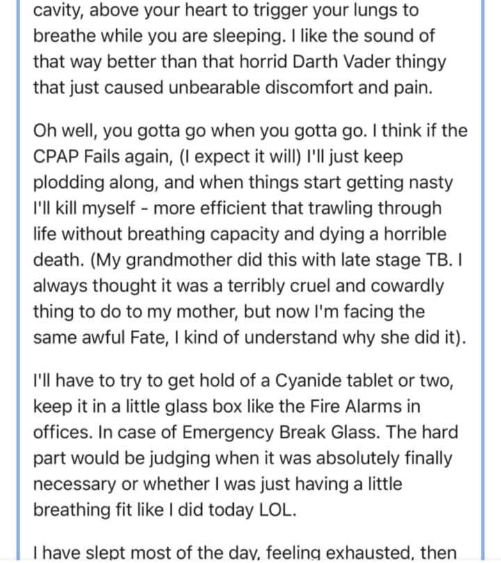 She does not understand the compounding effects of end-state complex ptsd from being abused in early childhood. Nor the effects of not being financially viable or successful. Nor the effects of not being loved by good, kind partners and thereafter not ever being able to find a safe mutual permanent trustworthy love relationship/partnership. Nor the effects of barely surviving so many attacks on my body in adulthood either.